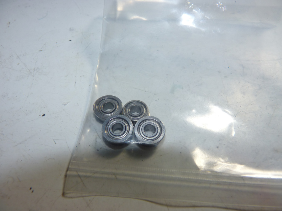 Now we install the wheels and finish up. We install the flanged bearings into the front wheels and mount them up.