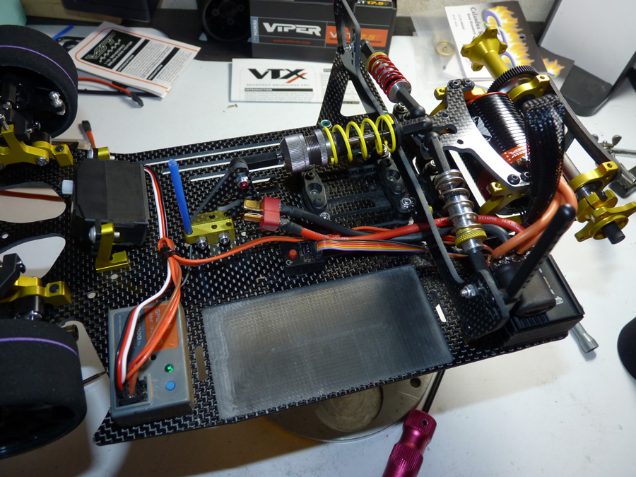 Here she is all ready to go at Walt’s Hobby on a practice day. I installed the servo horn and steering links at the track and made all other (camber, etc) adjustments there.